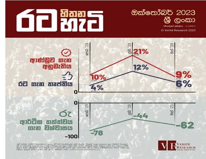 ජූනි මාසයේදී සියයට 21 ක් වූ ආණ්ඩුව පිළිබඳ ජනතා අනුමැතිය ඔක්තෝබර් මාසයේදී සියයට 9ක් දක්වා පහත වැටී ඇතැයි වෙරිටේ රිසර්ච් ආයතනය පෙන්වා දුන්නේය.