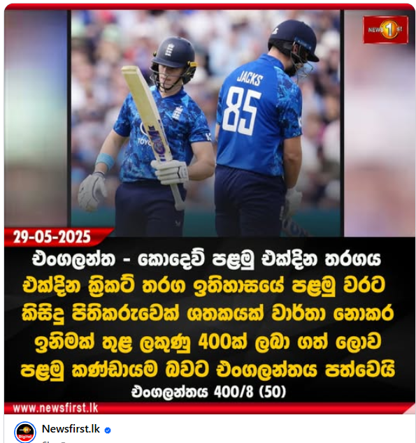 එක්දින ක්රිකට් තරග ඉතිහාසයේ පළමු වරට කිසිදු පිතිකරුවෙක් ශතකයක් වාර්තා නොකර ඉනිමක් තුළ ලකුණු 400ක් ලබා ගත් ලොව පළමු කණ්ඩායම බවට එංගලන්තය පත්වෙයි.