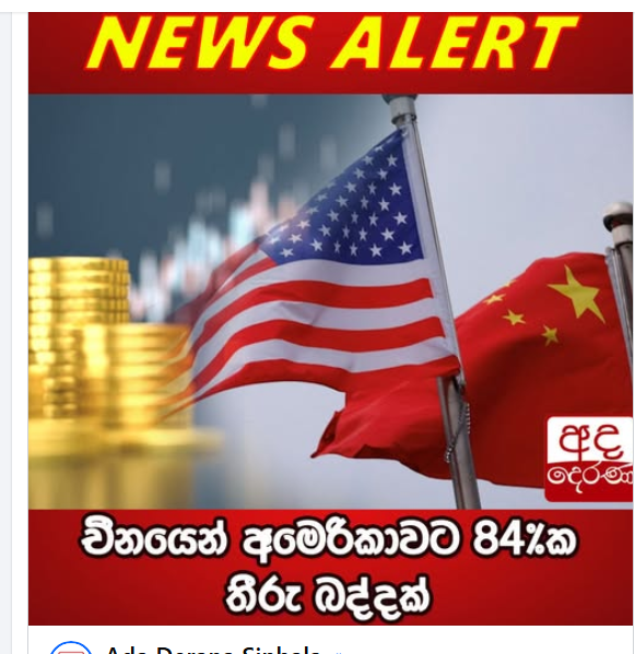 ඒ අනුව, චීන මුදල් අමාත්යාංශය, අමෙරිකා එක්සත් ජනපදයෙන් ආනයනය කරන ලද භාණ්ඩ සඳහා 84% ක තීරුබදු ප්රකාශයට පත් කිරීමට කටයුතු කර ඇත.
