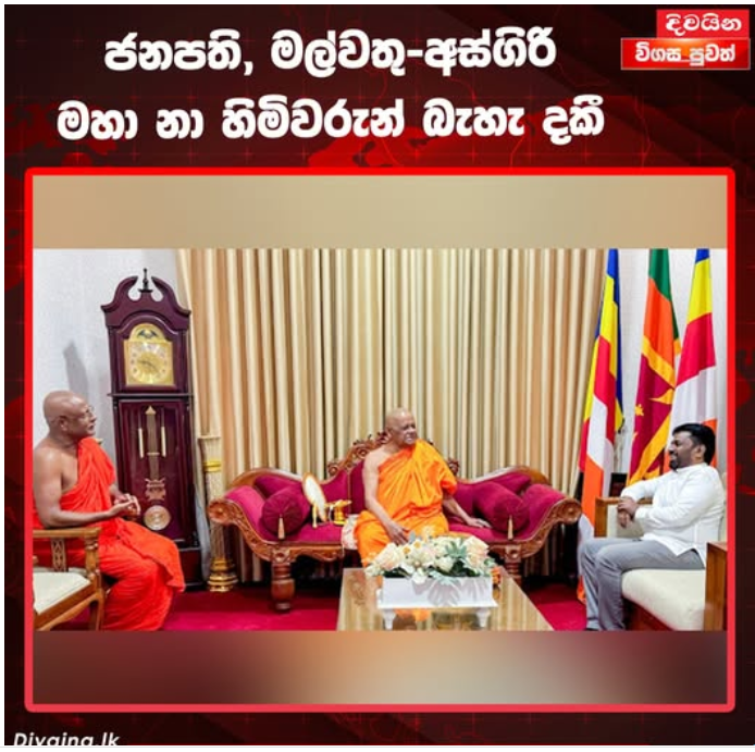 ජනාධිපති අනුර කුමාර දිසානායක මහතා අද (25) පෙරවරුවේ සියම් නිකායේ මල්වතු සහ අස්ගිරි පාර්ශ්වයේ මහා නා හිමිපාණන් වහන්සේලා බැහැ දැක ආශිර්වාද ලබා ගත්තේය.