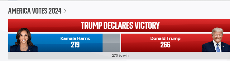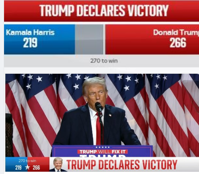 එක්සත් ජනපද මැතිවරණයේ දැනට නිකුත් කර ඇති ප්‍රතිපල අනුව ඩොනල්ඩ් ට්‍රම්ප්ගේ ජයග්‍රහණය දැනටමත් ස්ථිර වී ඇත. තවත් ප්‍රාන්ත කිහිපයක ප්‍රතිපල නිකුත් කිරීමට නියමිත අතර ජයග්‍රහණය සඳහා ලබාගතයුතු 270 සමස්ත චන්දවලින් 266 ප්‍රාන්ත වලින් මේවනවිට සමස්ත ප්‍රාන්ත වැඩි බලය ඩොනල්ඩ් ට්‍රම්ප්ගේ රිපබ්ලිකන් පක්ෂයට දිනාගැනීමට හැකිවී තිබේ. ඩෙමොක්‍රටික් පක්ෂයේ කමලා හැරිස් ලබාගෙන ඇත්තේ 219 පමණි. මේ නිසා දැනට නිකුත් කර ඇති ප්‍රතිපල අනුව ඩොනල්ඩ් ට්‍රම්ප්ගේ ජයග්‍රහණය දැනටමත් ස්ථිර කර ඇත. මේ වන විට ලෝක නායකයන් රැසක්ම සිය සුබ පැතුම් ඩොනල්ඩ් ට්‍රම්ප් මහතාවෙත් ඒවා ඇතැයි සඳහන්වේ.