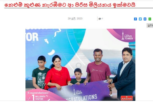 ඒ අනුව මාතලේ, විල්ගමුව ප්රදේශයේ සිව් දෙනෙකුගෙන් යුත් පවුලක අයෙකු පසුගිය 27වැනිදා නෙළුම් කුළුණ නැරඹීමට පැමිණි මිලියනයේ අමුත්තා බවට පත්වූ බව සීමාසහිත Colombo Lotus Tower Management Company Pvt Ltd සමාගම සදහන් කළේය.
