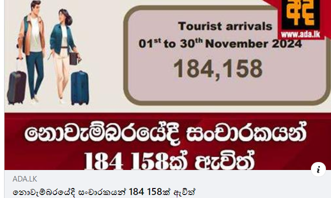 නොවැම්බර් මාසයේදී ශ්රි ලංකාවට සංචාරකයන් 184 158ක් පැමිණ ඇති බව ශ්රී ලංකා සංචාරක සංවර්ධන අධිකාරිය පවසයි. මෙය 2023 වාර්තා වූ 151 496ක් වූ අගය සැසදීමේසී සියයට 21.5ක වර්ධනයකි.