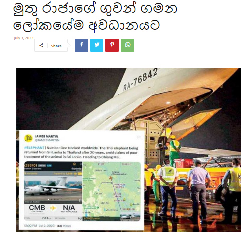 මුතුරාජා හස්තියා කටුනායක සිට තායිලන්තයට යන ගුවන් ගමන ලෝකයේම අවධානයට ලක්විය. එම රුසියානු ගුවන් යානයේ ගමන ඊයේ දිනයේ වැඩියෙන්ම නිරීක්ෂණය කළ පියාසැරිය ලෙස වාර්තා විය.