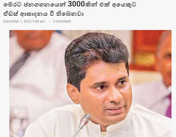 මෙරට ජනගහනයෙන් 3000කින් එක් අයෙකුට ඒඩ්ස් ආසාදනය වී තිබෙනවා
