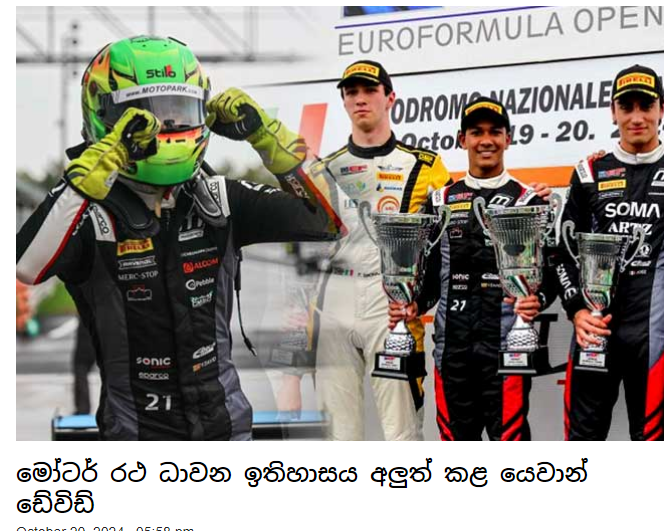ශ්රී ලංකා මෝටර් රථ ධාවන ශූර යෙවාන් ඩේවිඩ් ඉතාලියේ පැවති යුරෝ ෆෝමියුලා විවෘත මෝටර් රථ ධාවන තරගාවලියේ 8වන අදියරේ ජය හිමිකර ගැනීමට සමත්විය.