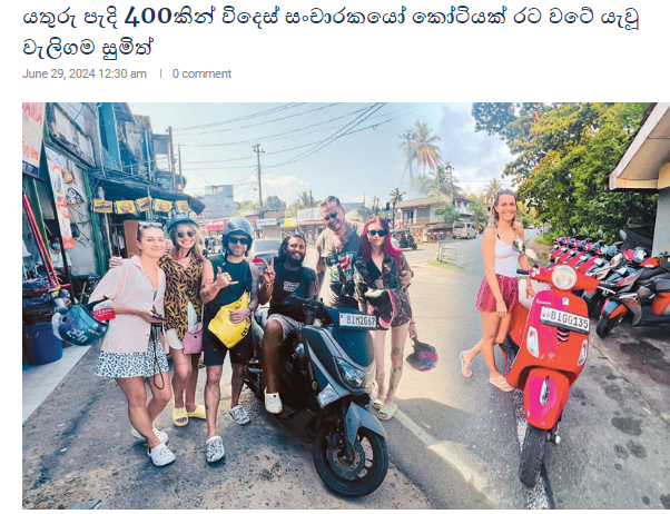 “මේ වෙද්දි අපි ළඟ යතුරුපැදි 400කටඅධික සංඛ්යාවක් තියෙනවා. 2016 සිට මේ දක්වා දළ වශයෙන් අපි විදේශිකයන් මිලියන 10කට වැඩි සංඛ්යාවකට සේවය සලසා තිබෙනවා. යතුරුපැදි බදු දීමට අමතරව අපි විදේශිකයන්ට හෝටල් පහසුකම් සැපයීම, ඔවුන්ට මතුවන ගැටලුවලදී උපදේශනය සැලසීම ආදී සේවා ද සපයනවා. ඒ අනුව 2023 වසරේ පමණක් එවැනි සියලුම සේවා වෙනුවෙන් මිලියනයක් පමණ විදේශීය සංචාරකයන්ට අපගේ සේවය ලබා දී තිබෙනවා. ඒ ගැන අපිට හරිම සතුටුයි. ඊට හේතුව ඔවුන්ට සේවය සැලසීමෙන් අපිට මුදල්වලට අමතරව වටිනා දෙයක් ලැබෙනවා. අපේ සේවය ගැන තෘප්තිමත් වන විදේශිකයන් නැවත ඔවුන්ගේ රටට යන්නේ අපේ රට ගැන ධනාත්මක හැඟීමකින්. ඔවුන් අපේ සේවය ගැන විතරක් නෙවෙයි අපේ රට ගැනත් ඔවුන්ගේ මිතුරු මිතුරියන්ට කියනවා. ඔවුන් නැවත නැවත ලංකාවේ සංචාරය කරන්න එනවා. එයින් අපේ රටට විදේශ විනිමය ලැබෙනවා වගේම අපේ රට ගැන ලෝකයේම අවධානයට ලක්වෙනවා. එය සංචාරක කර්මාන්තයේ දියුණුවට ලොකු පිටිවහලක්”