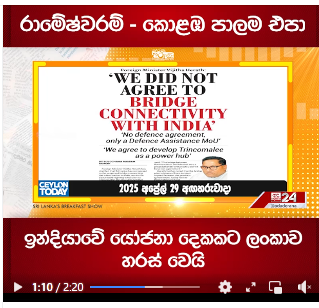 රාමේෂ්වරම් – කොළඹ පාලම එපා – ඉන්දියාවේ යෝජනා දෙකකට ලංකාව හරස් වෙයි