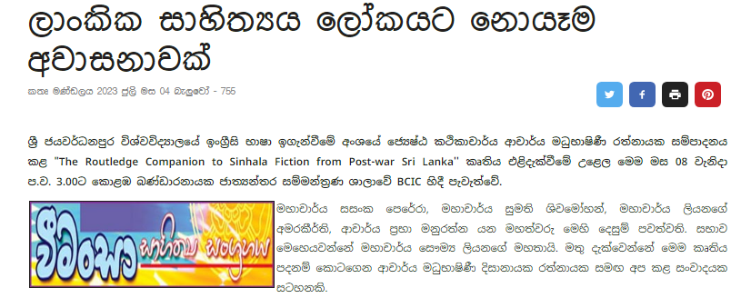 ශ්‍රී ජයවර්ධනපුර විශ්වවිද්‍යාලයේ ඉංග්‍රීසි භාෂා ඉගැන්වීමේ අංශයේ ජ්‍යෙෂ්ඨ කථිකාචාර්ය ආචාර්ය මධුභාෂිණී රත්නායක සම්පාදනය කළ “The Routledge Companion to Sinhala Fiction from Post-war Sri Lanka” කෘතිය එළිදැක්වීමේ උළෙල මෙම මස 08 වැනිදා ප.ව. 3.00ට කොළඹ බණ්ඩාරනායක ජාත්‍යන්තර සම්මන්ත්‍රණ ශාලාවේ BCIC හිදී පැවැත්වේ.