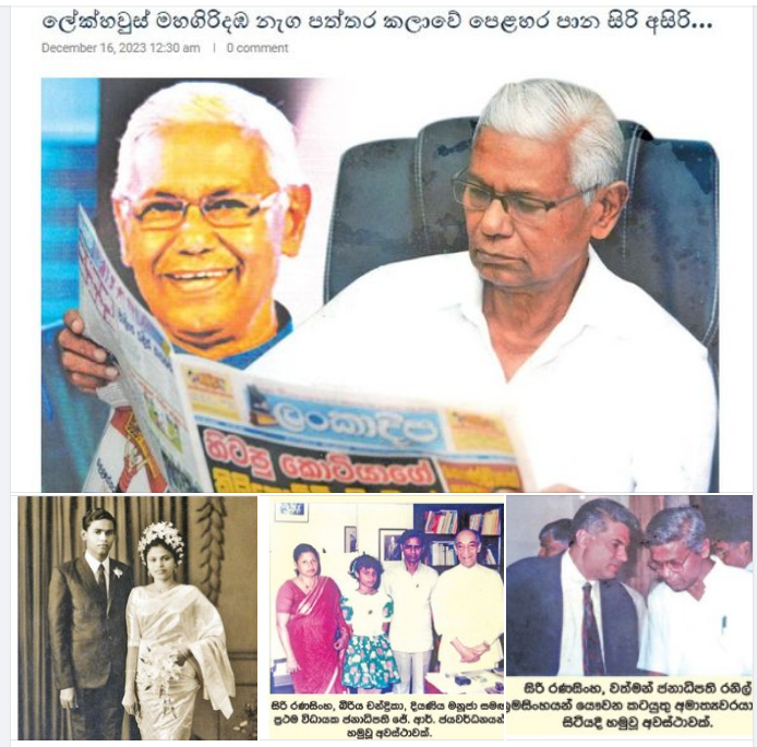 ශ්රී ලාංකේය පුවත්පත් කලා ඉතිහාසය තුළ අඛණ්ඩව වසර 35කට ආසන්න කාලයක් ජාතික පුවත්පතක ප්රධාන කර්තෘත්වය දැරූ එකම පුවත්පත් කලාවේදියා වන සිරි රණසිංහයන්ගේ වෘත්තීය ජීවිතය පිළිබඳ විවරණය කෙරෙන ඇගැයුම් උලෙළ ‘සිරිඅසිරි’ නමින් දෙසැම්බර් 20 වැනිදා ශ්රී ලංකා පදනම් ආයතනයේදී පැවැත්වේ.