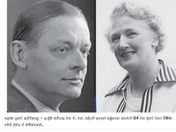 ලෝක ප්රකට ඇමරිකානු – ඉංග්රීිසි කවියකු වන ටී. එස්. එලියට් අපෙන් සමුගෙන ජනවාරි 04 වන දිනට වසර 58කි. මෙම ලිපිය ඒ නිමිත්තෙනි.