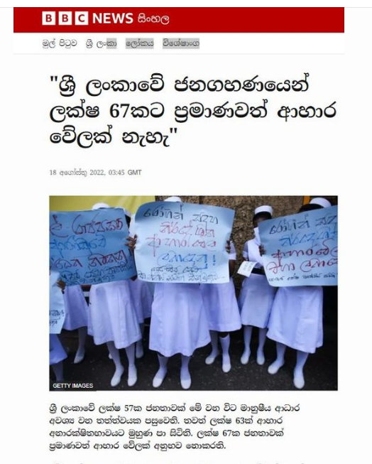 ශ්රී ලංකාවේ ලක්ෂ 57ක ජනතාවක් මේ වන විට මානුෂීය ආධාර අවශ්ය වන තත්ත්වයක පසුවෙති. තවත් ලක්ෂ 63ක් ආහාර අනාරක්ෂිතභාවයට මුහුණ පා සිටිති. ලක්ෂ 67ක ජනතාවක් ප්රමාණවත් ආහාර වේලක් අනුභව නොකරති.