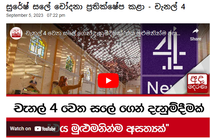 බ්රිතාන්යයේ ද ටයිම්ස් පුවත්පත සඳහන් කර තිබුණේ, මෙරට රාජ්ය බුද්ධි සේවාවේ ජ්යෙෂ්ඨ නිලධාරි සුරේෂ් සලේ මහතා සහ පාස්කු ප්රහාරයේ බෝම්බකරුවන් අතර 2018 වසරේ හමුවක් පැවති බව කියන ප්රවෘත්තියක් ඇසුරින් මෙම වීඩියෝව සකසා ඇති බවය.