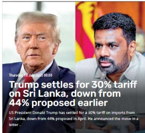 US President Donald Trump has settled for a 30% tariff on imports from Sri Lanka, down from 44% proposed in April.