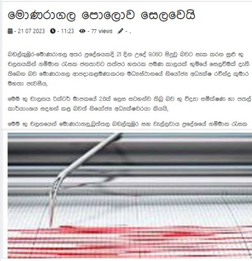 මොණරාගල බඩල් කුඹුර ප්‍රදේශයේ අද 21දා උදැසන සිදුවූ සුළු භුමි චලනයක් නිසා තප්පර 4 පමණ කාලයක් එම පෙදෙස්