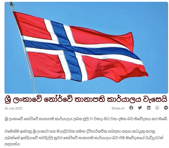 ශ්‍රී ලංකාවේ නොර්වේ තානාපති කාර්යාලය වැසෙයි