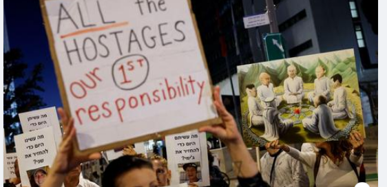 Protesters hold signs demanding the liberation of hostages who are being held in the Gaza Strip after they were seized by Hamas gunmen on October 7, in Tel Aviv, Israel November 21, 2023. REUTERS/Amir Cohen