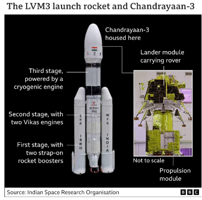 Graphic showing the LVM3 launch rocket, with three engine phases, and where the Chandrayaan-3 will be while it it carried into orbit