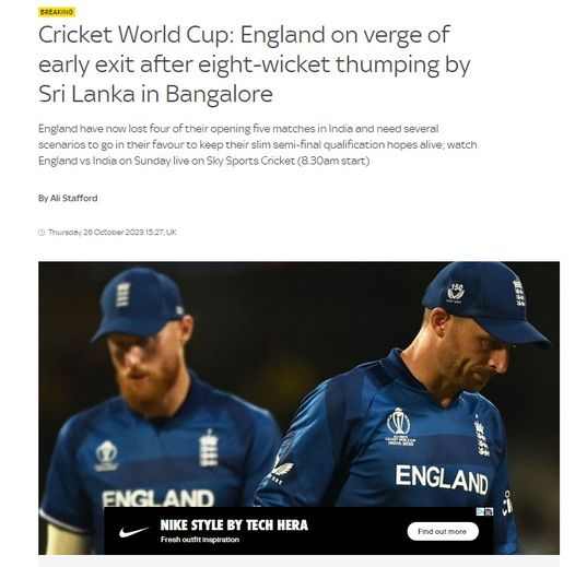 Cricket World Cup: England on verge of early exit after eight-wicket thumping by Sri Lanka in Bangalore