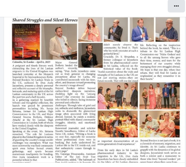 A poignant and timely literary work chronicling the lives of Sri Lankan migrants in the United Kingdom was launched yesterday at the Monarch Imperial in Sri Jayewardenepura Kotte. Beyond Borders: Sri Lankan Trials in the UK, authored by Don Asela Jayasekera, presents a deeply personal and reflective account of the triumphs, betrayals, and enduring spirit of the Sri Lankan community in the UK across the past two and a half decades.
