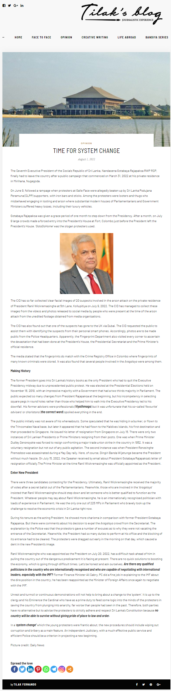 In a system change’ which the young protesters were frantic about, the new procedures should include wiping out corruption and bribery as a main feature. An independent Judiciary, with a much effective public service and efficient Police should be a criterion in projecting a new beginning.