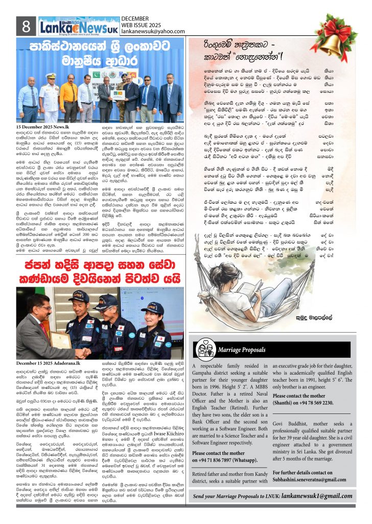 දිට්වා කුණාටුවෙන් හා නායයාම් වලින් විනාශයට පත්වූ සහ ආනාථ වූවන් සඳහා මානුෂිය ආධාර මේ වන විටත් ගලාඑමින් පවතී. මිලියන 2ක පමණ ජනකායක් මේ ව්යයසනයට ගොදුරුවී ඇත. ලක්ෂ දෙනක පමණ ජනතාව අවතැන්වී ඇති අතර 65800 ගේ තත්වය බරපතල යයි සඳහන් වේ. දැනට ආධාර දී තිබෙන ප්රධාන රටවල් ඇමරිකා එක්සත් ජනපදය ඩොලර් මිලියන 2 හා ද්රව්යමය ආධාර ප්රවාහන ගුවන් යානා හා සහන කණ්ඩායම්, බි්රතාන්යය පවුම් මිලියන එකයි. ද්රව්යමය ආධාර, එක්සත් ජාතීන්ගේ සංවිධානය ඩොලර් 1,75000, ලෝක සෞඛ්ය සංවිධානය ඩොලර් මිලියන 4.5, ආසියානු සංවර්ධන බැංකුව ඩොලර් මිලියන 3, ආහාර ද්රව්ය, චීනය ඩොලර් මිලියන 1, ද්රව්යමය ආධාර. ජපානය ඩොලර් ලක්ෂයයි ජංගම රෝහල් හා බෙහෙත්, චීන රතු කුරුස සංගමය ද්රව්යමය ආධාර, මාල දිවයින, ඉන්දියාව සාගර් බන්දු නැව් මගින්, ගුවන්යානා, හෙලිකොප්ටර් මුදා ගැනීමේ මෙහෙයුම් හා ද්රව්යමය ආධාර, පාලම්, ගලවා ගැනීමේ සහන කණ්ඩායම්, මාල දිවයින ඩොලර් 50,000, ටුනා මලු ටින්. පකිස්තානය ගුවන්යානා හෙලිකොප්ටර් ගලවා ගැනීමේ මෙහෙයුම් හා ද්රව්යමය ආධාර, නේපාලය මියන්මාරය, කැනඩාව, ස්විට්සර්ලන්තය, ප්රංශය, යුරෝපා සංගමය, බංගලාදේශය, ආරාබි එමිර් රාජ්යය, සෞදි අරාබිය, රුසියාව, මේ අනුව පසුගිය සතිය වනවිට ශ්රී ලංකාව මුදලින් ලැබූ මුදල් ප්රමාණය රුපියල් බිලියන 3.4 විය.