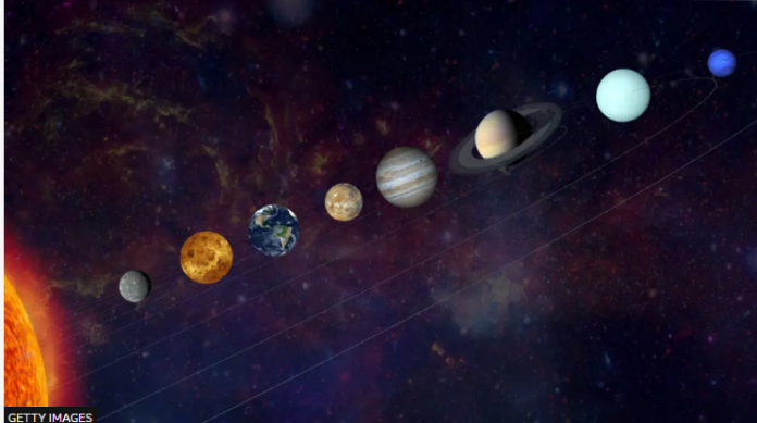 How an artist imagines the planets in our solar system lined up in a row – of course it isn’t quite that straightforward