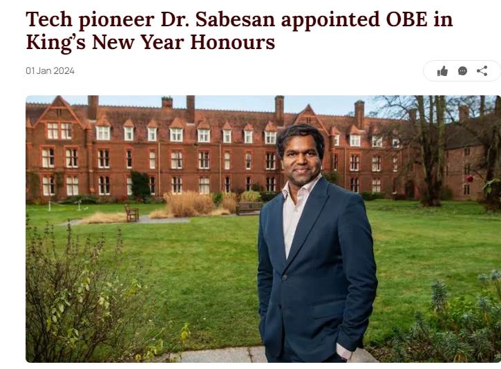 Tech pioneer Dr. Sabesan appointed OBE in King’s New Year Honours