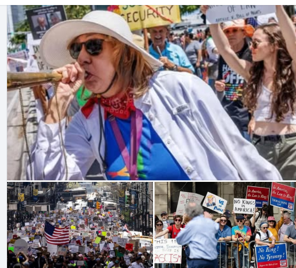 Many demonstrators carried signs reading “No Kings,” a nod to the anniversary of the start of the country’s revolution against English rule.