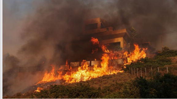 Flames engulf a house as a wildfire burns in Saronida, near Athens, Greece, July 17, 2023. REUTERS/Stelios Misinas